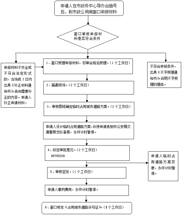 1、申请人在市政务中心导办台抽号后,到市政公用局窗口申报材料。窗口人员对材料进行初审,材料初审合格后予以受理,发放受理通知书;材料不齐或不符合法定形式的,一次性告知申请人;
